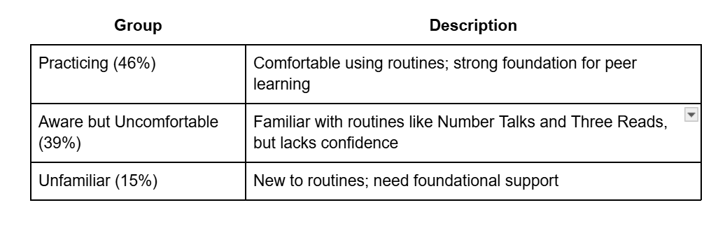 Pre-institute survey data revealed that educators prioritize student-centered approaches in lesson planning, with a focus on access, engagement, and differentiation. One educator explained, “Each lesson should have a launch, at least one main activity, and an exit ticket to assess students’ understanding,” demonstrating thoughtful planning aligned with HQIM principles. Educators need hands-on experience with how HQIM translates into daily practice. Survey data on familiarity with the 12 instructional routines from Illustrative Math revealed three groups: